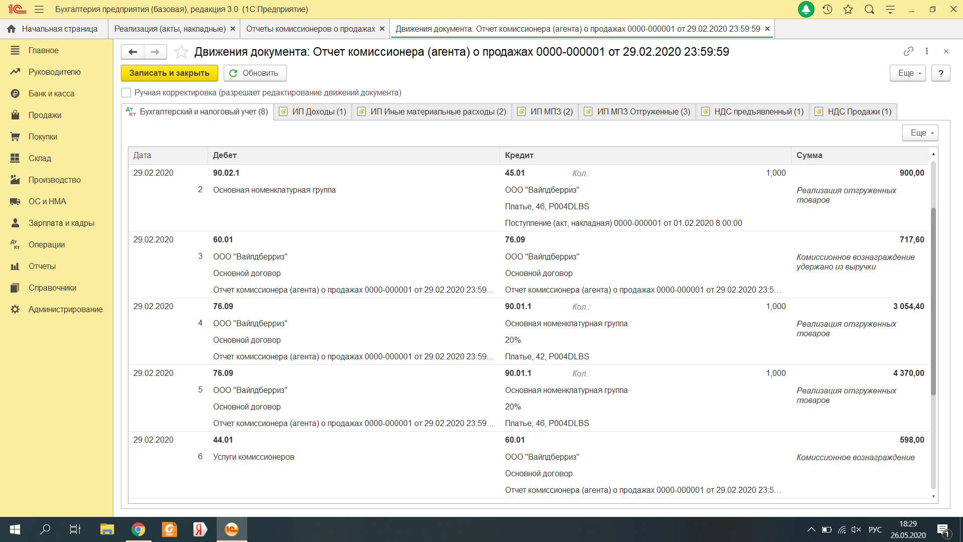 Коллеги, подскажите, почему не формируется КУДиР. ИП реализует товар через Вайлдберриз. Завожу сначала поступление товара - проводка 41.01/60.01, затем предачу ВБ делаю через реализацию - 45.01/41.01 и далее отчет комиссионера о продажах, в котором формируются вот такие проводки