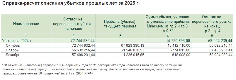 Согласно п. 2.1 ст. 283 НК РФ (действует до конца 2026 года), налоговая база не может быть уменьшена более чем на 50% за счёт убытков прошлых лет.